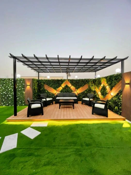 - تصميم وتنسيق الحدائق: زراعة طبيعية، عشب صناعي، وأنظمة ري حديثة.