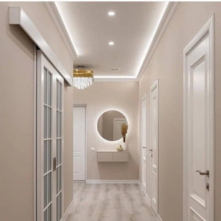 - الإضاءة المخفية: استخدام شرائط الـ LED المخفية ببراعة في الأسقف الجبسية (الجبس بورد) الحديثة، وحول الإطارات الجدارية، لخلق إحساس بالارتفاع والعمق والنعومة.