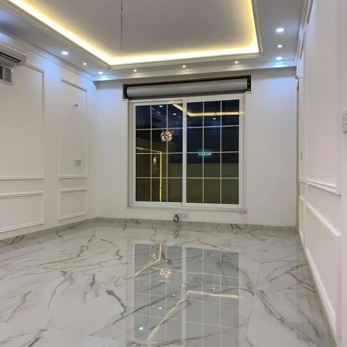 - الرخام والجرانيت الفاخر: استخدامه بشكل مبتكر في الأرضيات (بلاط كبير الحجم)، وتكسية الجدران، وتصميم المدافئ. الألوان الأكثر طلباً هي العروق البارزة (Veining) باللون الأبيض الكريمي والأسود مع العروق الذهبية.