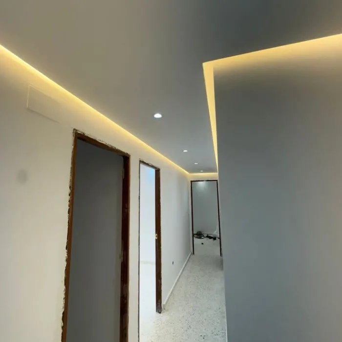 - ديكورات الجبس المعاصرة: الابتعاد عن النقوش الكثيفة والتركيز على الخطوط الهندسية النظيفة، التكوينات المنحنية، ودمج فواصل الاستيل المعدني أو الفوم الأنيق داخل التصميم الجبسي لإضافة تباين بصري.
