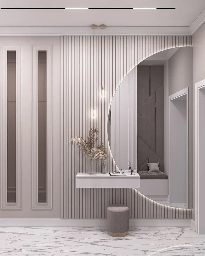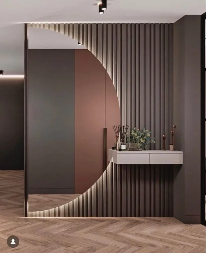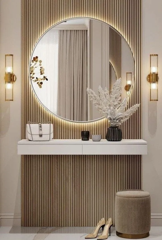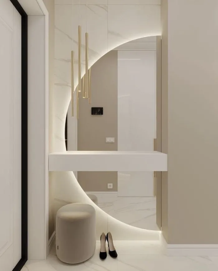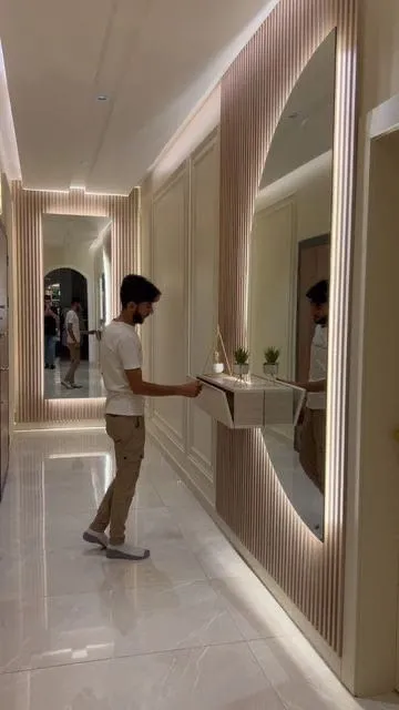 - المرايا بلمسة فنية: لم تعد المرايا مجرد أدوات، بل تحف فنية. استخدام مرايا ذات إطارات مميزة أو مرايا مقطعة بأشكال هندسية يُعد حيلة تصميمية فعالة لتوسيع المساحة وزيادة انعكاس الإضاءة.