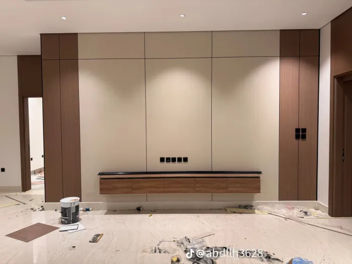- الخشب الديكوري: لمسة دافئة وعصرية. سواء كانت ألواحًا طولية بسيطة (الستايل الاسكندنافي) أو تصاميم هندسية معقدة، يضيف الخشب شعوراً بالراحة والرقي.