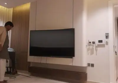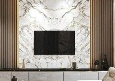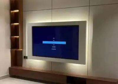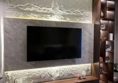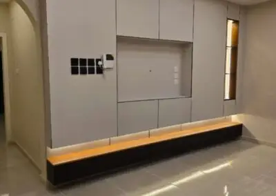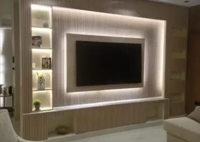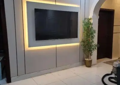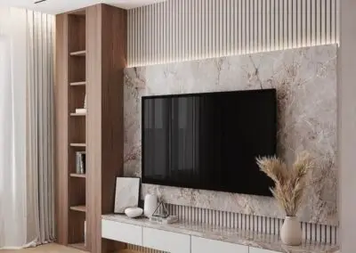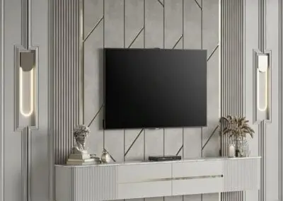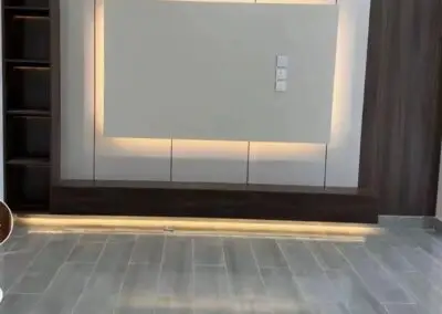 - الدفء والأناقة: يضفي الخشب إحساساً فورياً بالراحة والدفء، مما يحول منطقة المشاهدة إلى زاوية مريحة وجذابة.