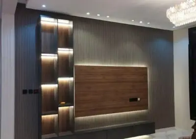 دمج إضاءة بيضاء دافئة أو صفراء خافتة خلف الألواح الخشبية يضيف عمقاً ودفئاً للمكان دون أن تكون مصدر إزعاج بصري.