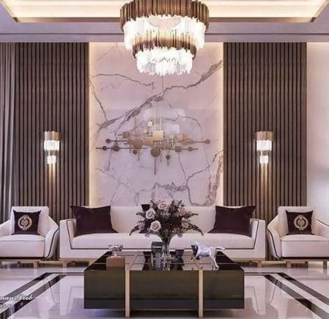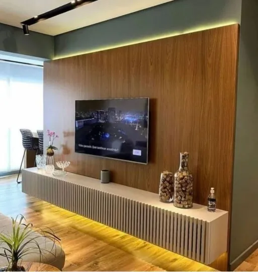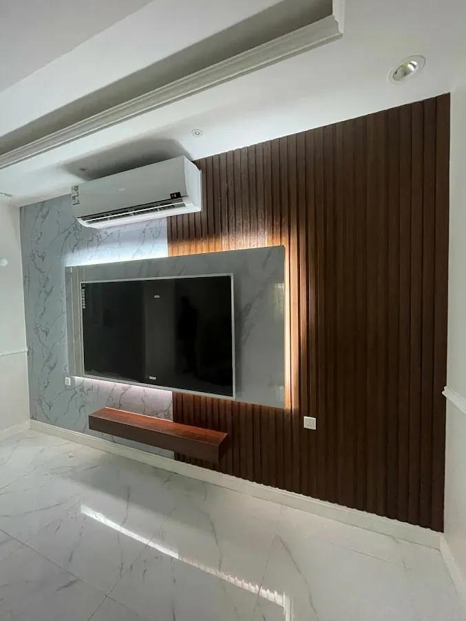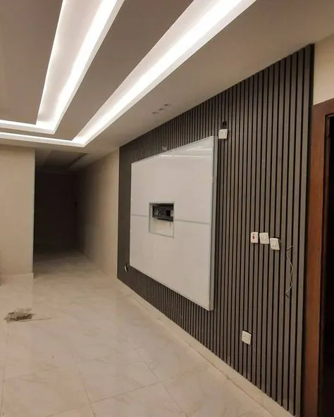- خلفيات التلفاز: دمج ألواح بديل الخشب الطولية مع بديل الرخام في المنتصف لخلق نقطة تركيز بصرية مذهلة.