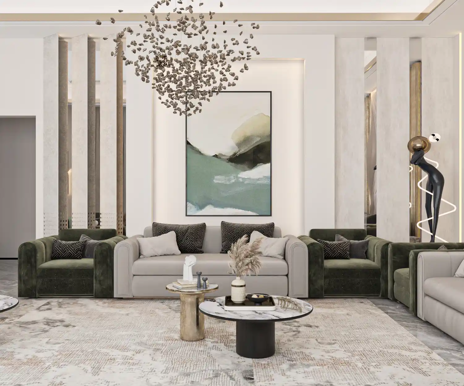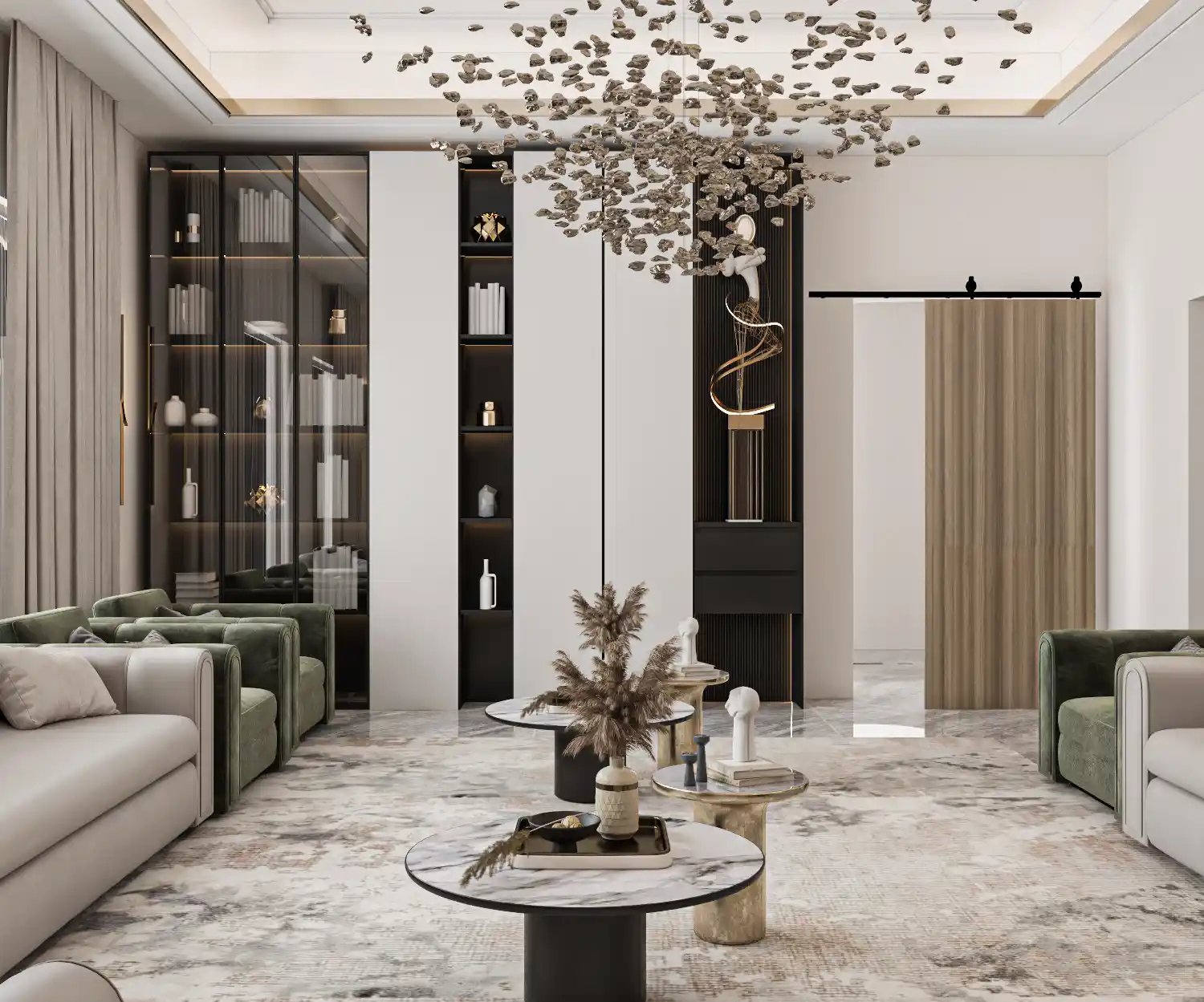 - المواد: تبرز في ديكورات الفلل الفاخرة استخدام الرخام الطبيعي في الأرضيات والجدران، والخشب الصلب في الأبواب والأثاث.