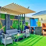 عندما يمتزج جمال المظلة بـ خضرة العشب الصناعي، تتشكل لوحة فنية فريدة من نوعها. فالمظلة توفر مساحة مظللة ومحمية، بينما يخلق العشب الصناعي أرضية ناعمة ومريحة تضفي شعورًا بالانتعاش والاسترخاء. هذا المزيج المثالي يحول أي استراحة عادية في رماح إلى واحة حقيقية من الهدوء والجمال، مما يزيد من قيمتها ويعزز من جاذبيتها.